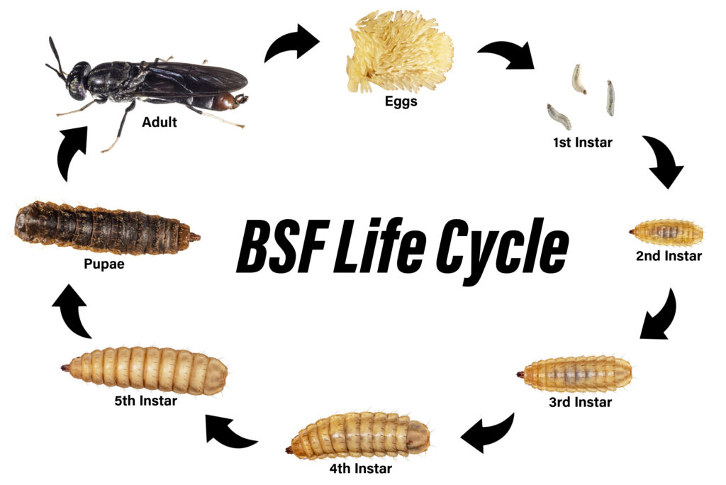 This amazing insect has a unique life cycle that sees it feed on a wide variety of organic wastes as larvae with voracious appetites which grow into pupa, then adult flies, which lay eggs that hatch into larvae again.