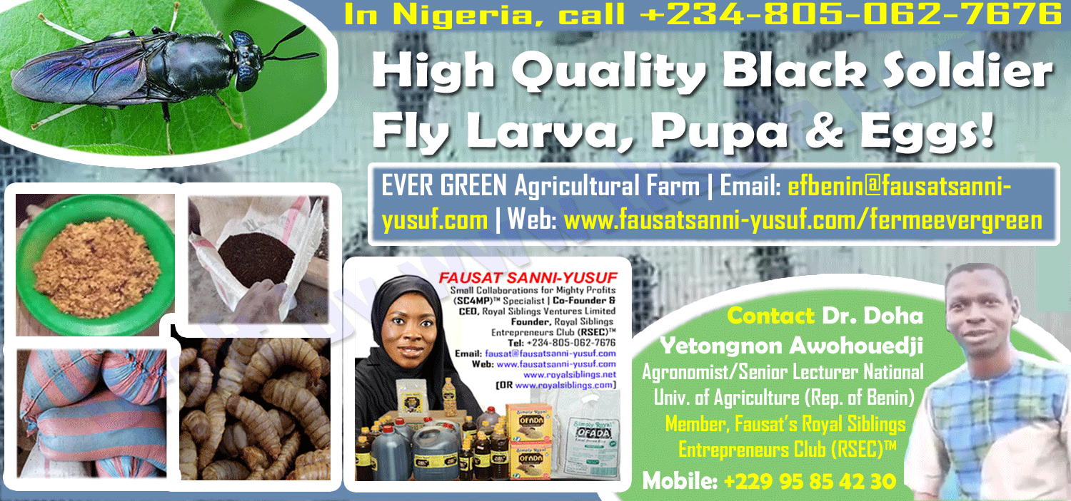 EDUCATIONAL STOREFRONT FOR FARM BIZ BUYERS IN NIGERIA. Common Name: Black Soldier Fly | Scientific Name: Hermetia illucens | Identification: large; dark-colored; 2 white patches just behind wings; flattened appearance; larvae and pupae: dark brown and flattened; 1 inch long. Click below for more about this storefront.